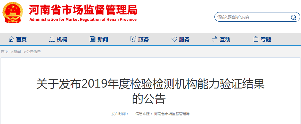 为贯彻落实《国务院关于加强质量认证体系建设 促进全面质量管理的意见》(国发〔2018〕3号),提升检验检测能力水平,更好服务经济社会发展,河南省市场监督管理局组织开展了2019年度检验检测机构能力验证工作。现将结果公告如下:
