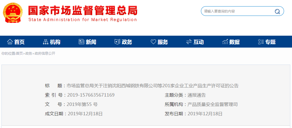 近日,国家市场监管总局官网发布公告,注销201家企业工业产品生产许可证,详情如下: