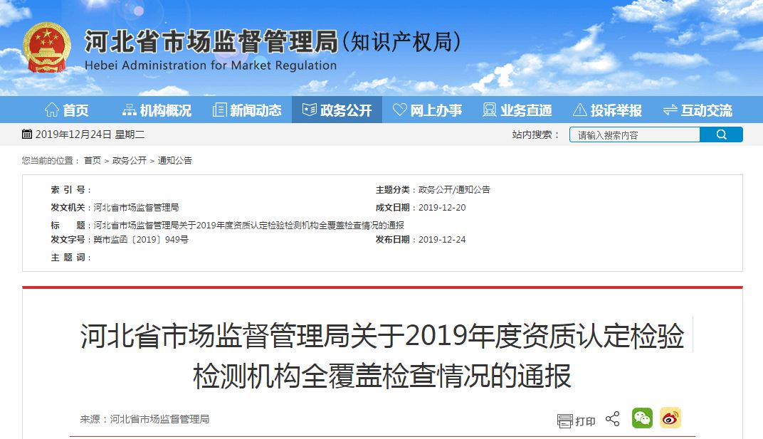河北省市场监督管理局关于2019年度资质认定检验检测机构全覆盖检查情况的通报
