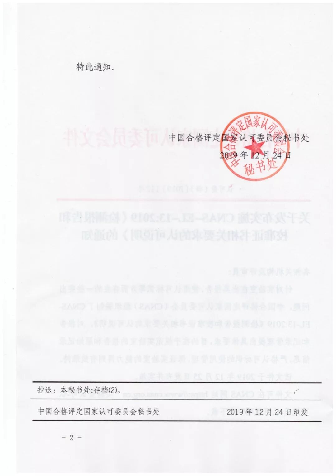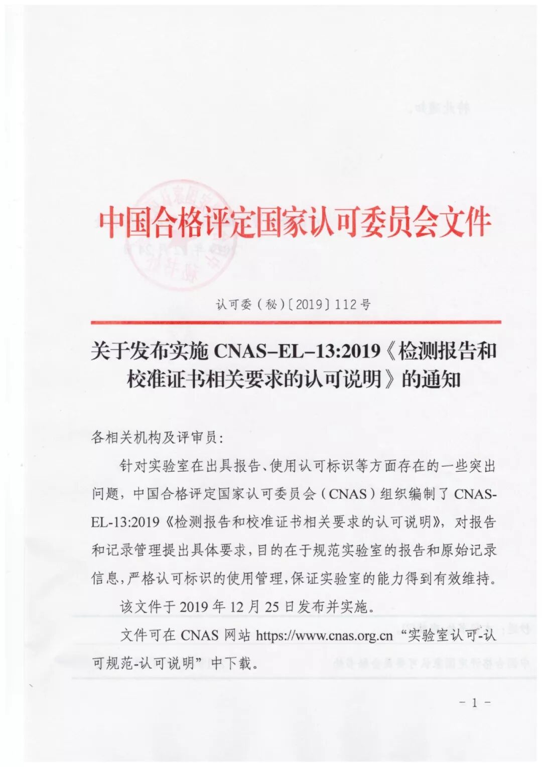 关于发布实施CNAS-EL-13:2019《检测报告和校准证书相关要求的认可说明》的通知