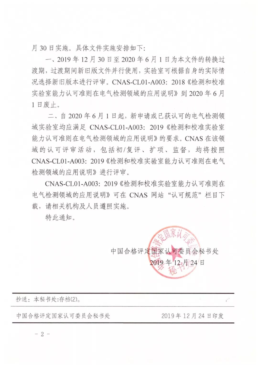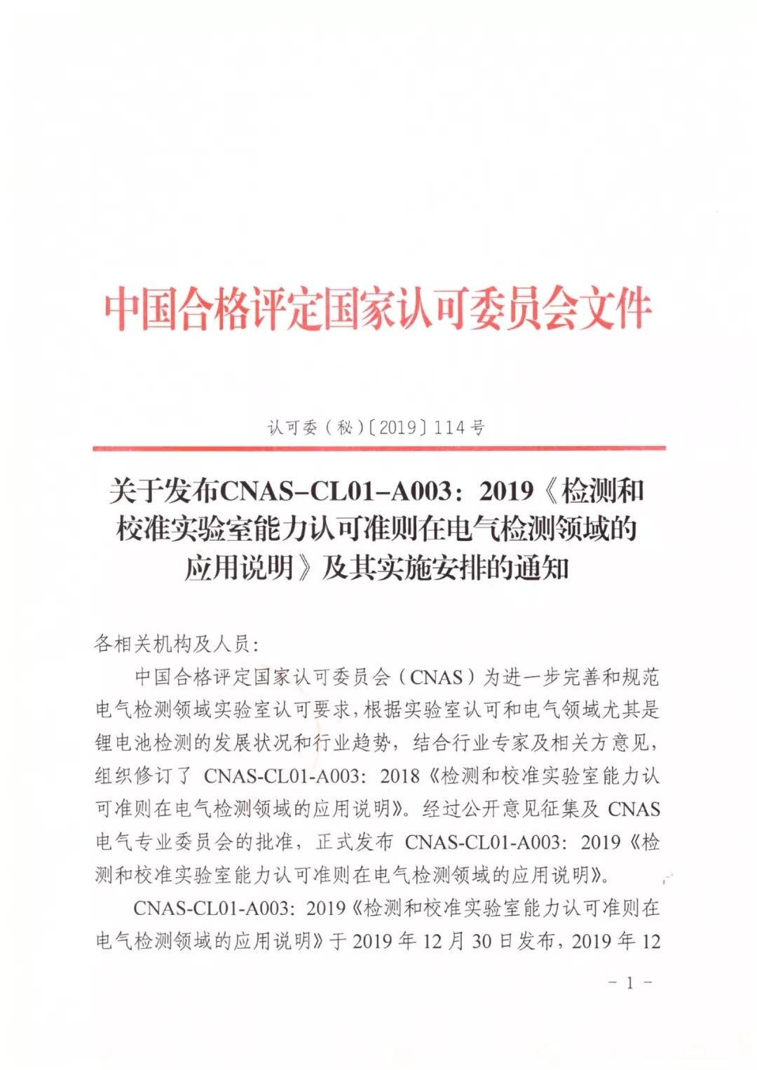 关于发布CNAS-CL01-A003:2019《检测和校准实验室能力认可准则在电气检测领域的应用说明》及其实施安排的通知