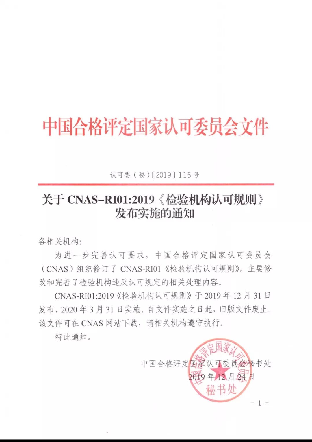 关于CNAS-RI01:2019《检验机构认可规则》发布实施的通知