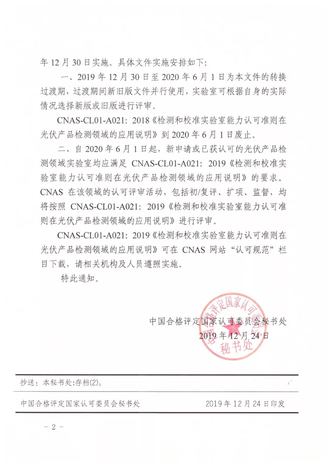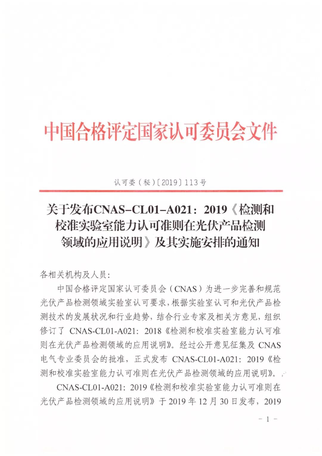 关于发布CNAS-CL01-A021:2019《检测和校准实验室能力认可准则在光伏产品检测领域的应用说明》及其实施安排的通知