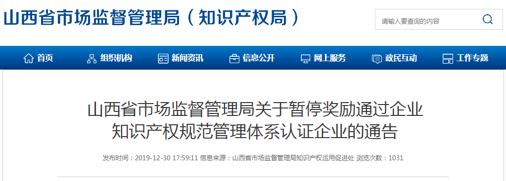 近日,山西省市场监督管理局发布通告,即日起暂停执行《山西省全面推进知识产权强省建设行动方案》(晋政办发〔2019〕81号)第一条第(4)款“对通过‘贯标’绩效评价或认证的企业,一次性给予20万元奖励”。详情如下: